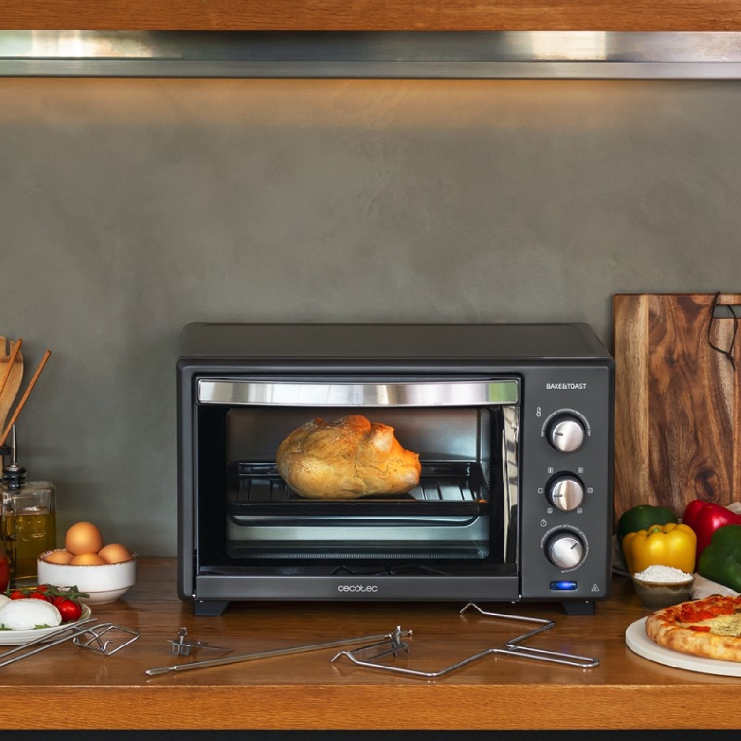 Inclui espeto giratório que permite assar frangos com calor distribuído em 360º.