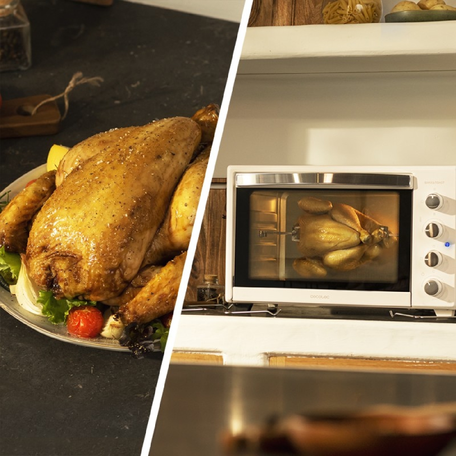 Cozinha por convecção de forma homogénea com o ar que envolve os alimentos e consegue pratos tenros e saborosos.