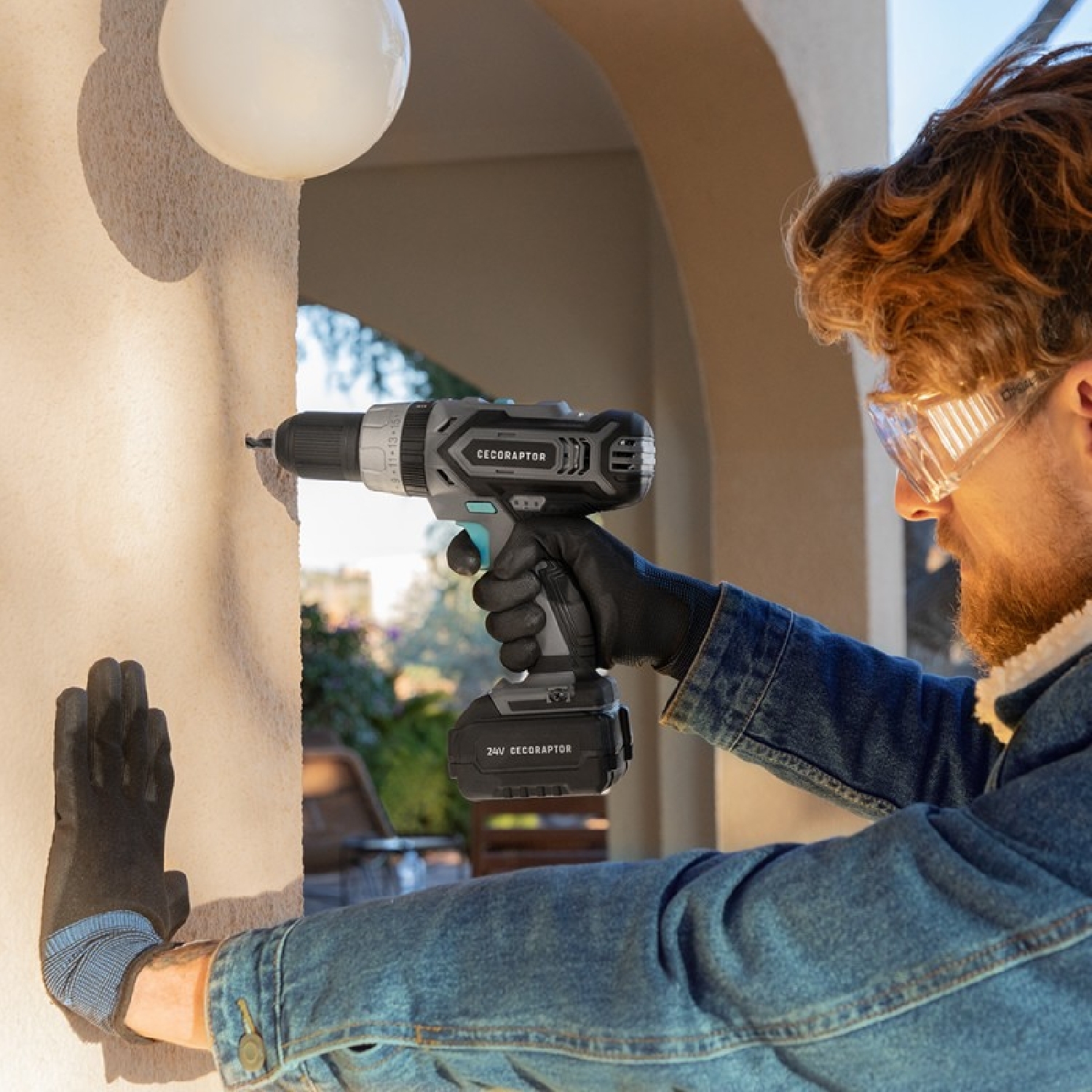 Berbequim/aparafusadora com percussão com bateria de 24 V e 2.000 mAh, motor DC 775, velocidade sem carga 0-400/ 0-1.550 rpm, taxa de impacto 0-6.000 / 0-22.500 bpm, torque máximo de 50 Nm com 25+1+1 ajustes de torque e 2 velocidades, mandril de broca de aperto rápido automático 2-13 mm, luz de trabalho, duração da bateria até 30 min. Inclui conjunto de 20 puntas e 20 brocas.