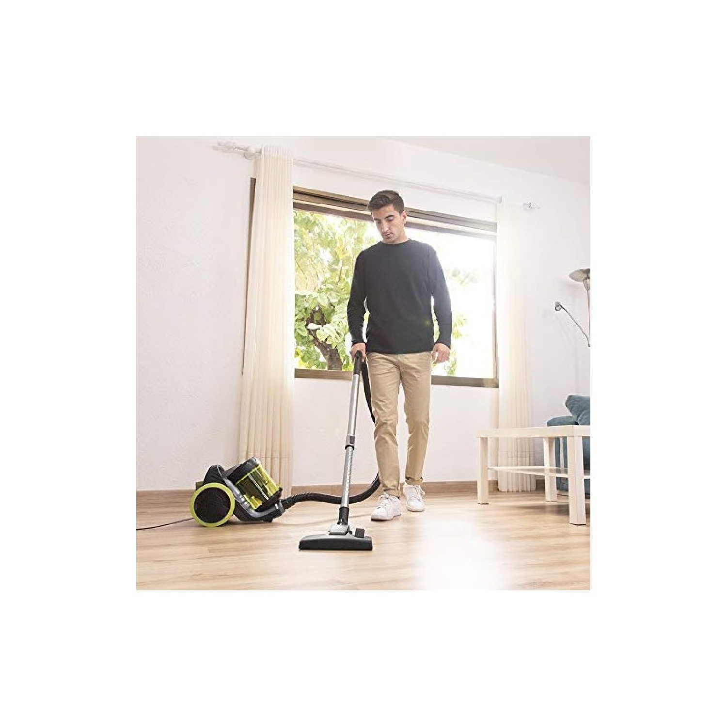 Aspirador trenó de 800 W de potência. Multiciclónico sem saco. Capacidade máxima do depósito até 3,5 L com filtragem de alta eficiência e tubo telescópico metálico.