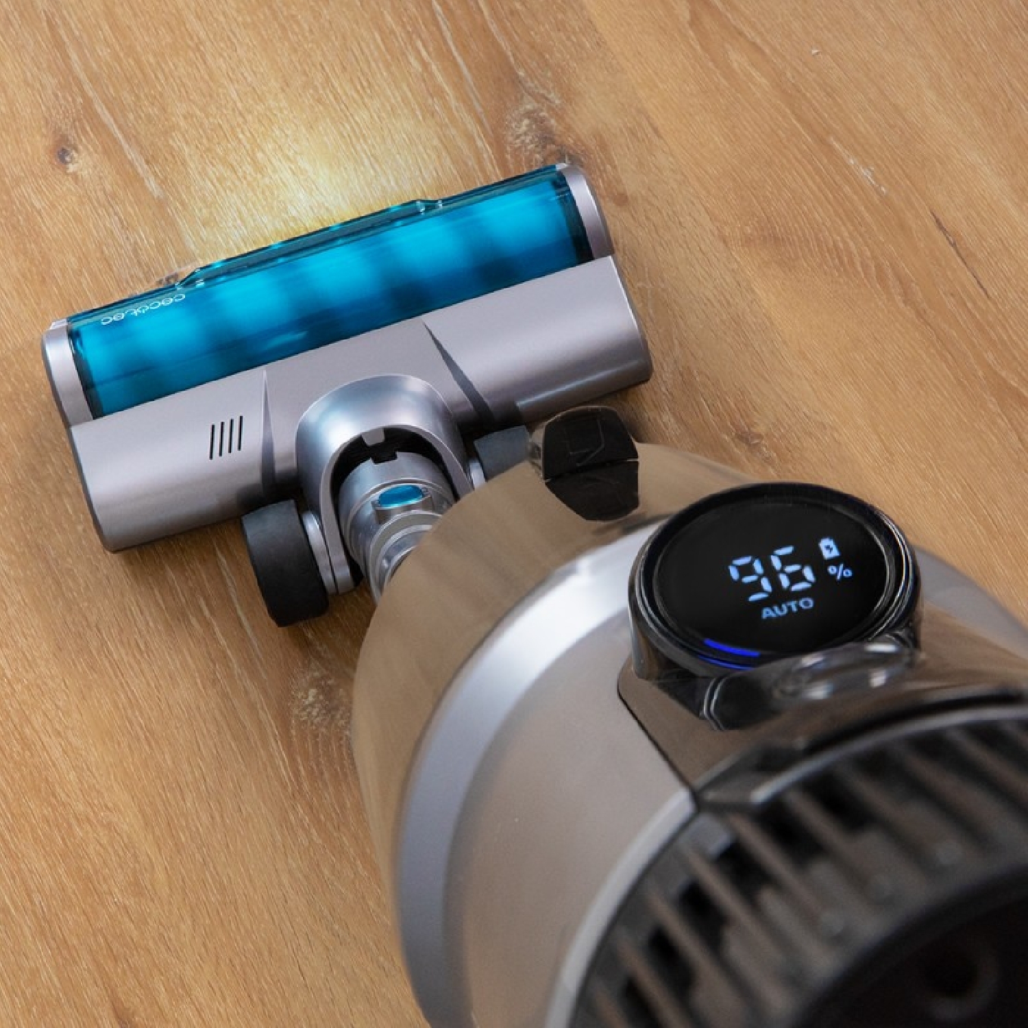 Pode observar o nível da bateria, mudar o modo de sucção e visualizar possíveis alertas graças ao seu ecrã digital.