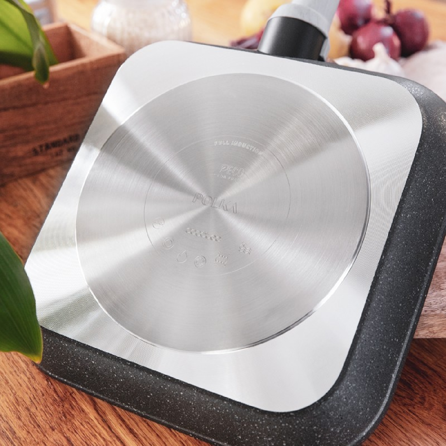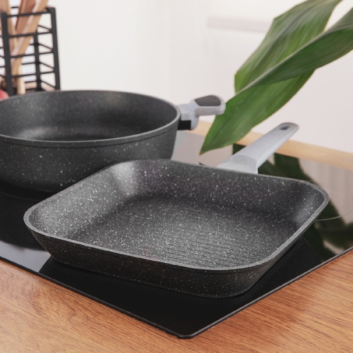 Grill de 28 cm de alumínio forjado de alta qualidade, conta com 6 camadas e revestimento antiaderente Select Teflon™ Nonstick Coating, livre de PFOA, com fundo difusor de calor Full Induction, apta para máquina da louça e para todos os tipos de fogões, incluindo indução. Fundo indeformável de 5 mm de espessura.