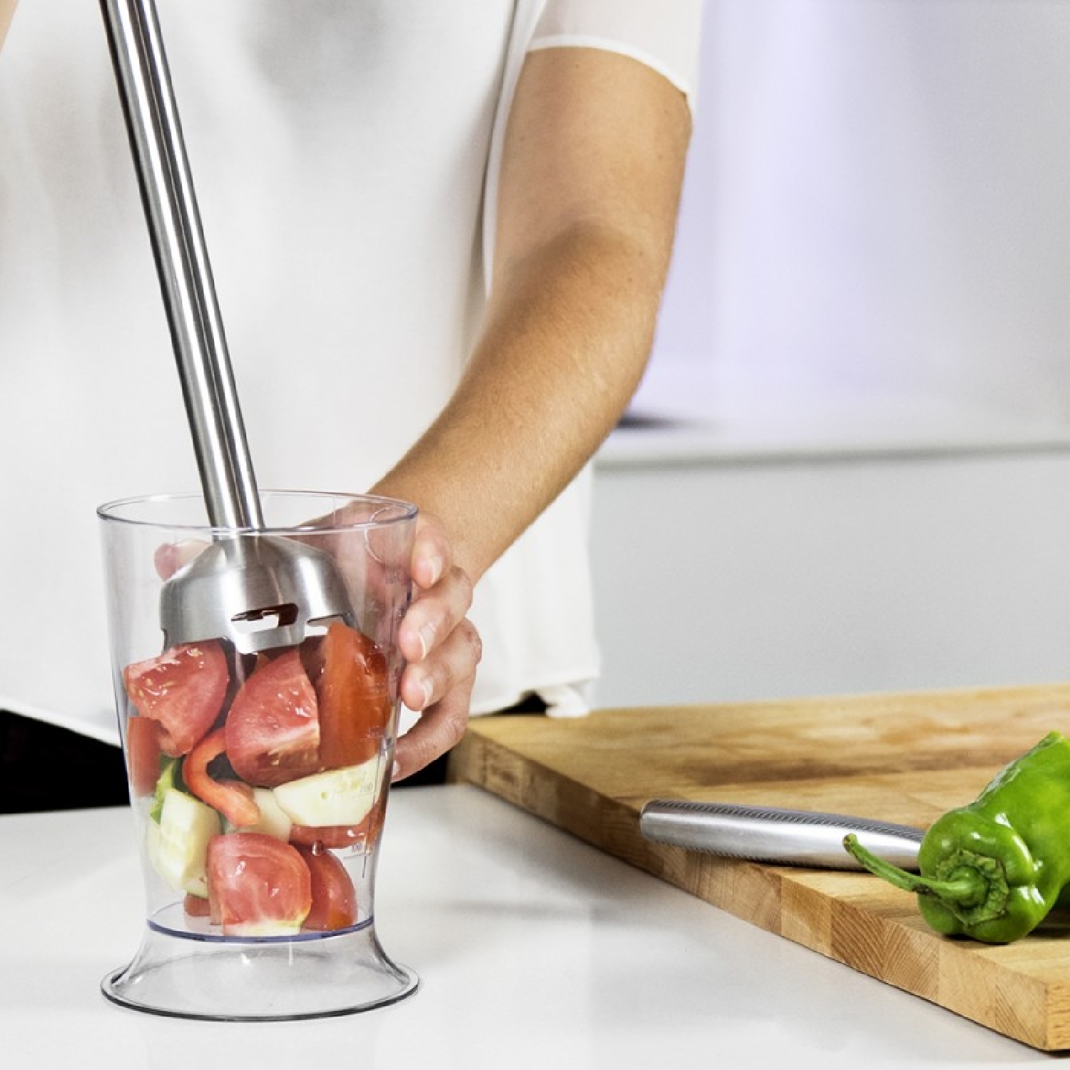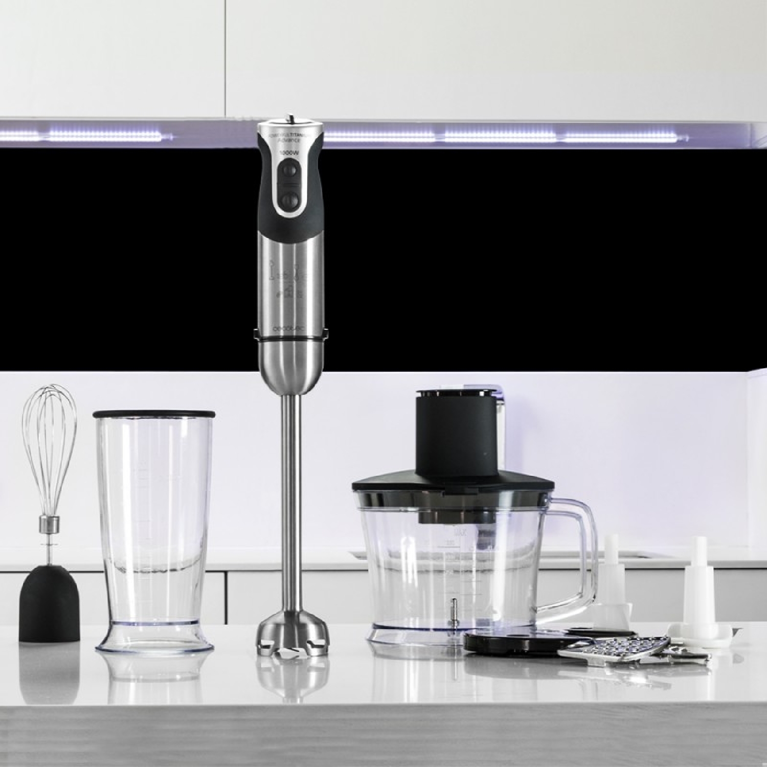 Inclui acessórios: copo com tampa e 800 ml de capacidade, calibrado em ml e oz, picadora de dupla lâmina de 1250 ml de capacidade, 4 discos de corte e varas para bater claras. Livre de BPA.