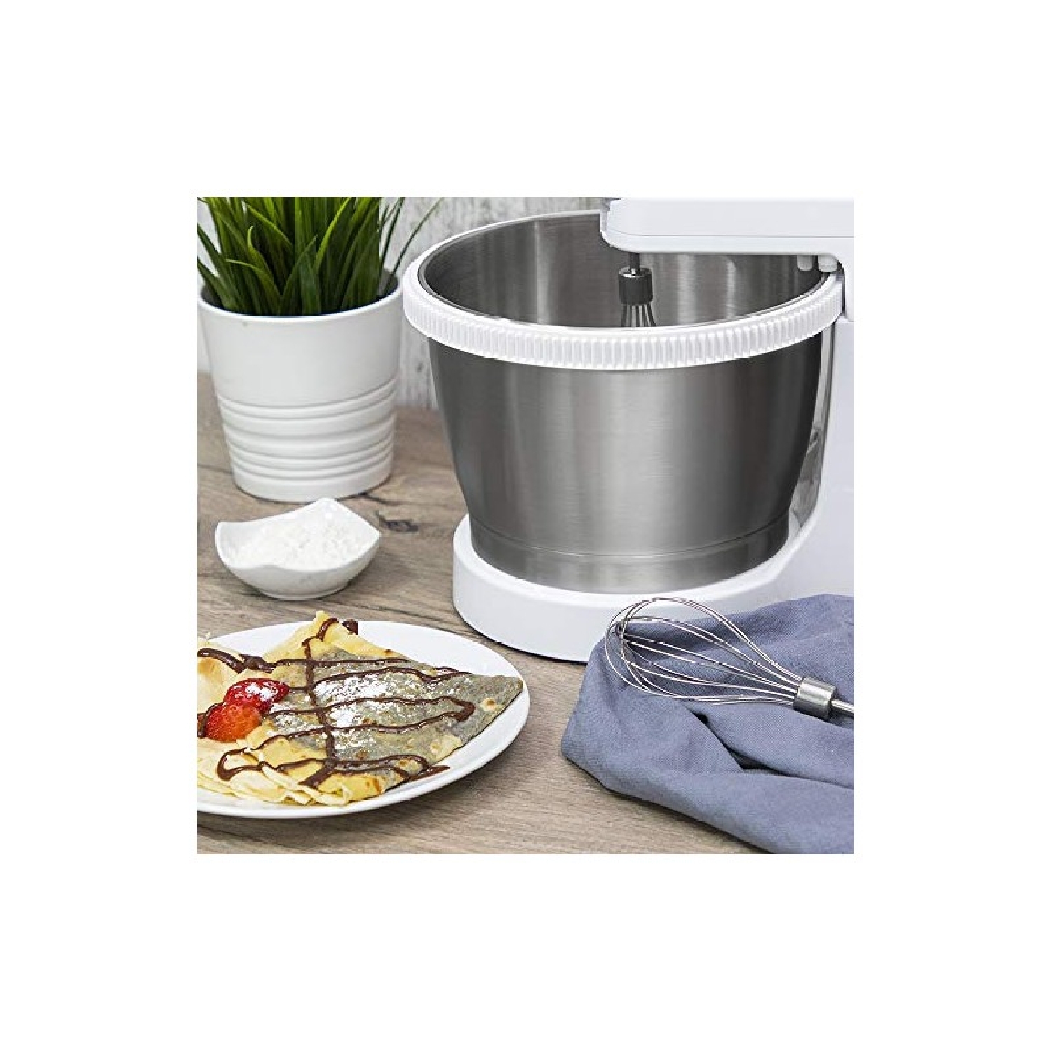 Inclui um batedor de claras em aço inoxidável para conseguir misturas perfeitas.