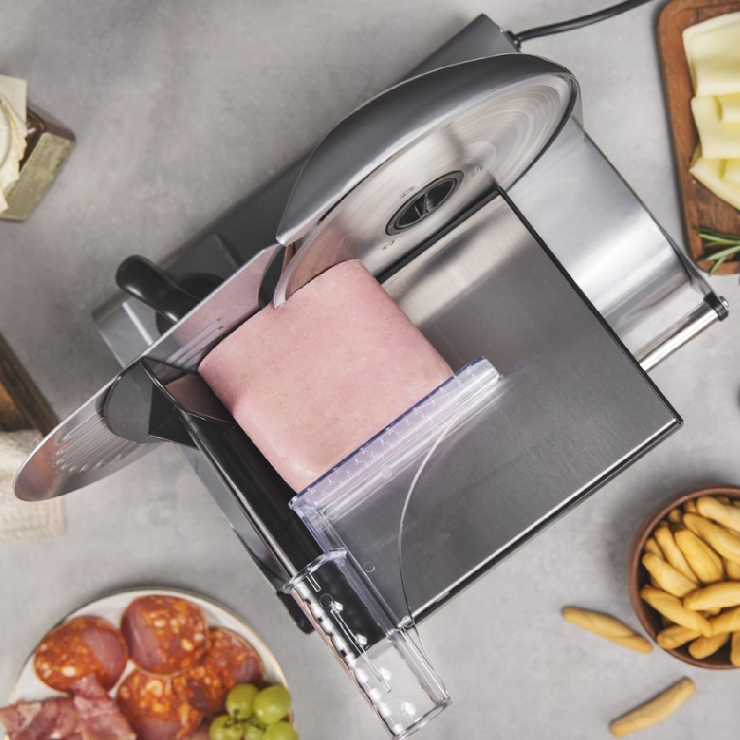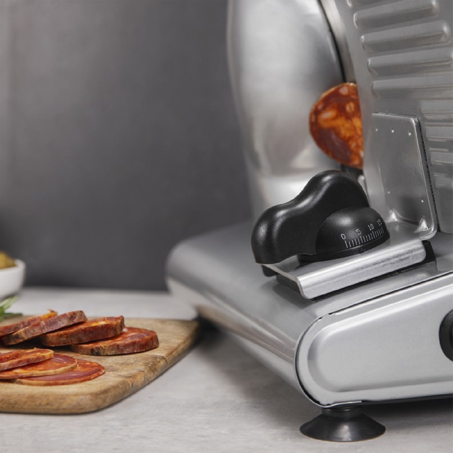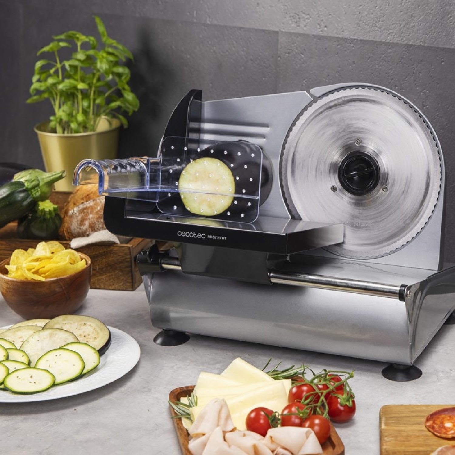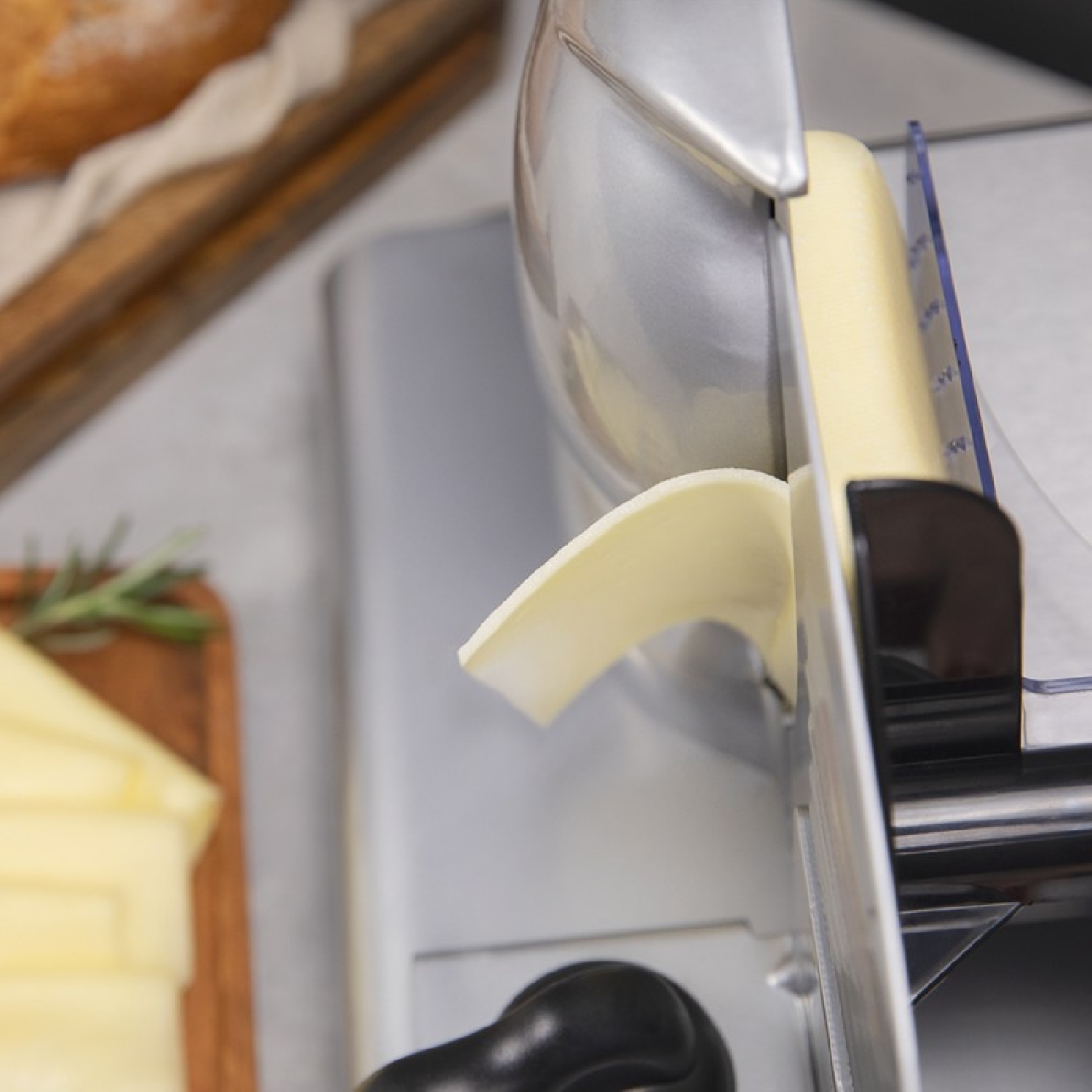Máquina de fatiar com 150 W de potência, perfeita para conseguir resultados impecáveis com todo tipo de alimentos.